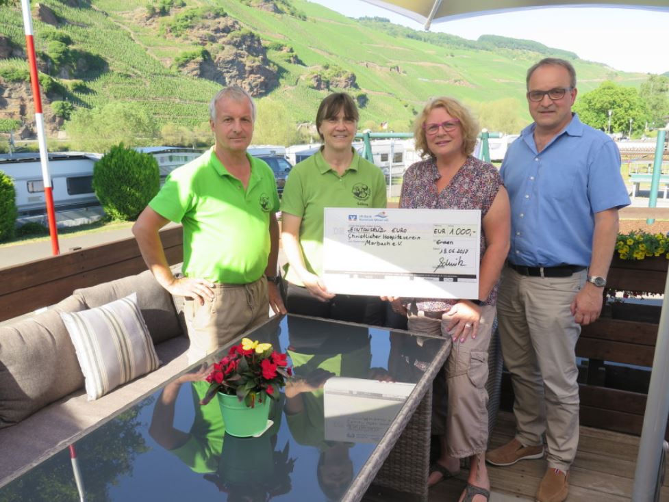 Den Erlös der jährlichen An- und Abcamp-Feier zu Saisonbeginn/-ende spenden sie an wechselnde regionale Projekte und so konnten die beiden Vorsitzenden des Christlichen Hospizvereins Morbach e.V. auf dem Campingplatz in Erden bei herrlichstem Sonnenschein in einer symbolischen Scheckübergabe 1.000 € für die Arbeit des Ambulanten Hospiz Morbach entgegennehmen.