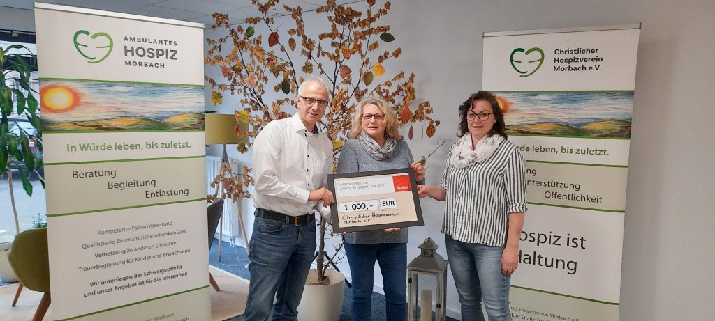 „Diese Spende ist ein tolles und bedeutsames Signal, in einer so schwierigen und auch finanziell für alle angespannten Zeit. Wir freuen uns sehr darüber und dass wir damit die Arbeit des ambulanten Hospiz Morbach weiter gut unterstützen können.“ freut sich Elke Weyand, die Vorsitzende des Christl. Hospizverein Morbach über die Spende der DekaBank, die auf Initiative von Wolfgang Künzer jetzt überreicht wurde.