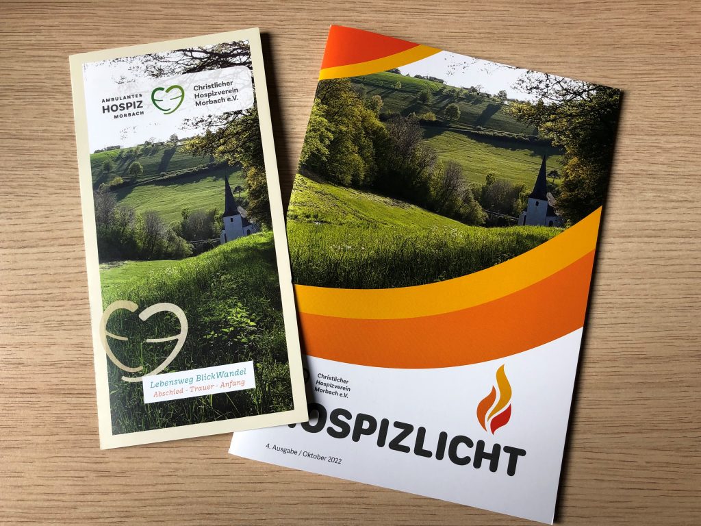 Das neue Hospizlicht und der Flyer zum Lebensweg BlickWandel – druckfrisch und vom Redaktionsteam sehnlichst erwartet.