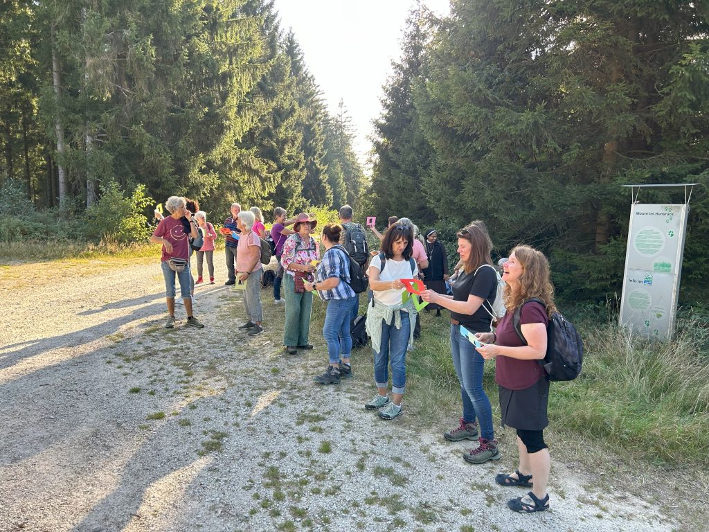 Im Anschluss führte uns der Weg weiter zum Hunsrückhaus am Erbeskopf. Bei strahlendem Spätsommerwetter stärkten wir uns zunächst mit einem Imbiss, bevor uns „Frau Doktor Wald“ – die Nationalparkführerin Beate Thome – zu einer Wanderung durch den Nationalpark begrüßte. Unterwegs lud sie uns mit Achtsamkeitsübungen und heiteren Hunsrücker Stickelcher dazu ein, die Natur mit allen Sinnen wahrzunehmen. Die frische Waldluft, die Bewegung und die innere Ruhe ließen uns Kraft schöpfen und die Verbundenheit zur Natur neu spüren.