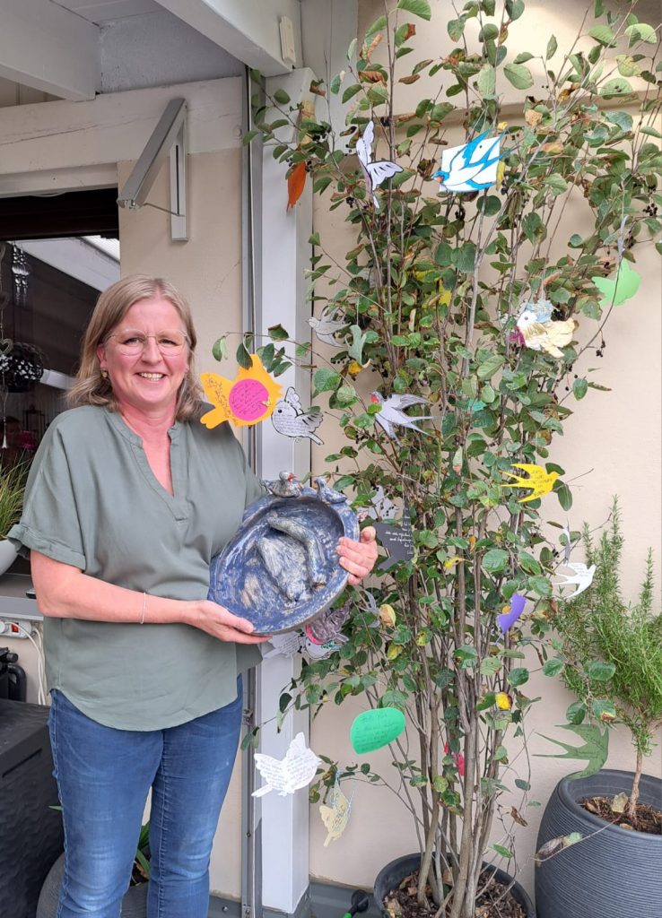 In einer kleinen Feierstunde wurde Alexandra nun verabschiedet. Die Ehrenamtlichen hatten für sie eine ganz besonderes Geschenk: einen Strauch, geschmückt mit kleinen, handgefertigten Papiervögelchen – jedes einzelne mit persönlichen Botschaften versehen – und eine Vogeltränke als Symbol für Fürsorge, Ruhe und Verbundenheit, gleichzeitig auch eine Anspielung auf eine weitere Leidenschaft: das Aufpäppeln verwaister Vogelkinder.